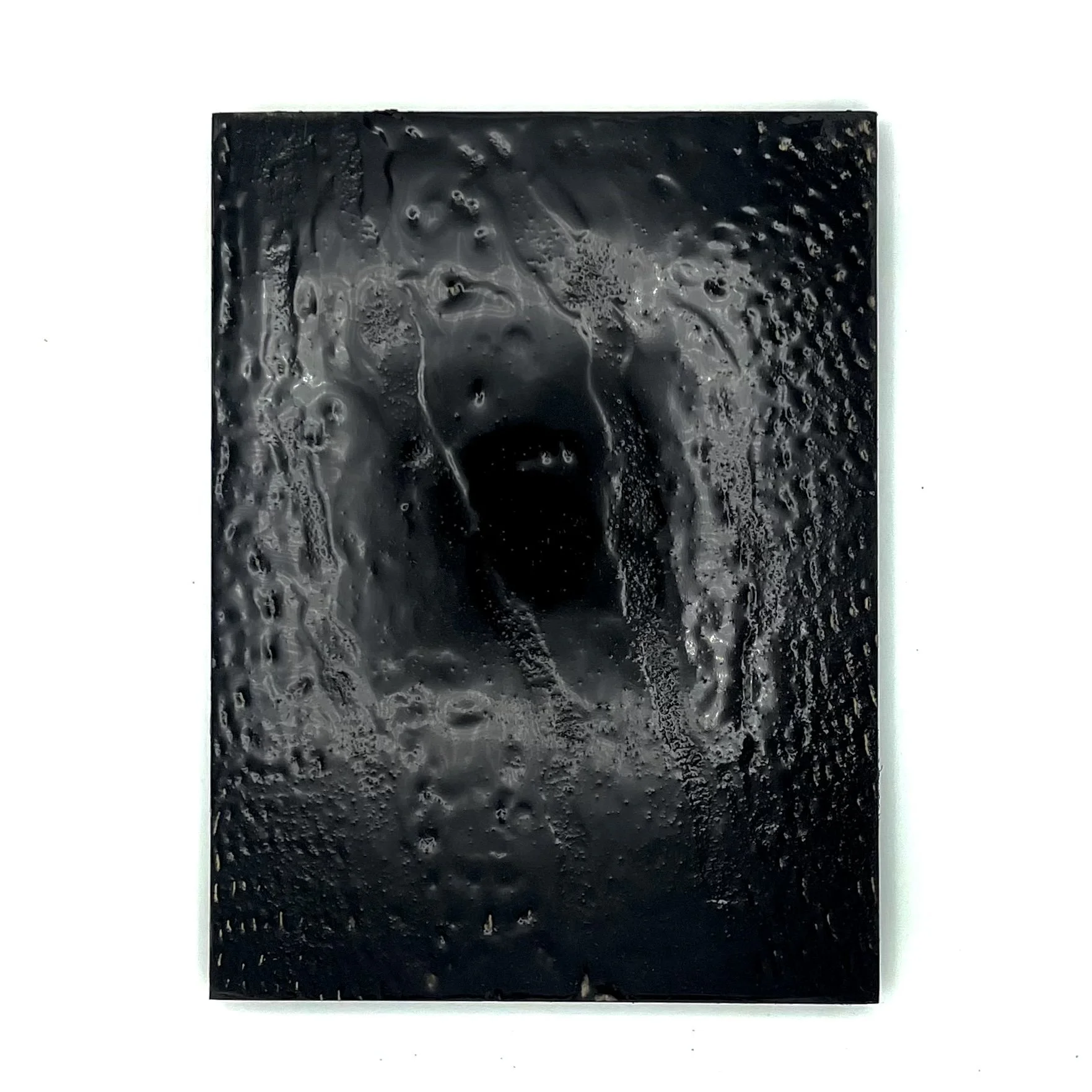 Large and small seams of coal draw concentric circles upon reflective layers of gesturally foregrounded oil and tar. Operating as a vignettes of microscopic & monumental proportions, this material abstraction excavates questions of cyclical natures.