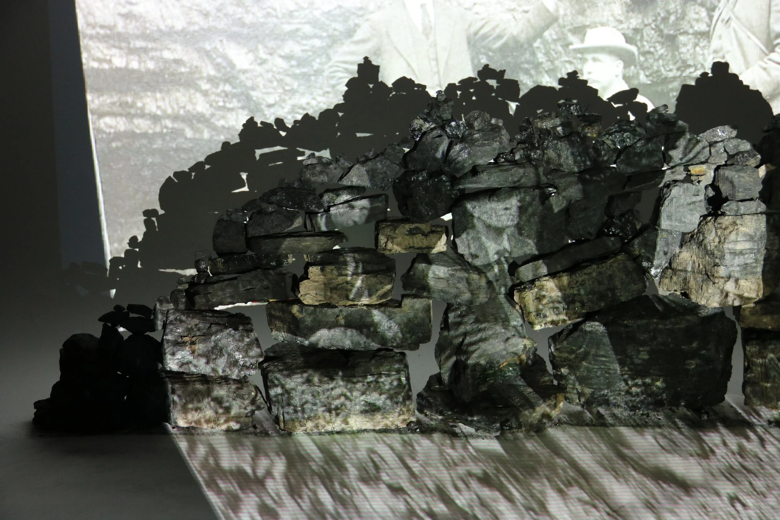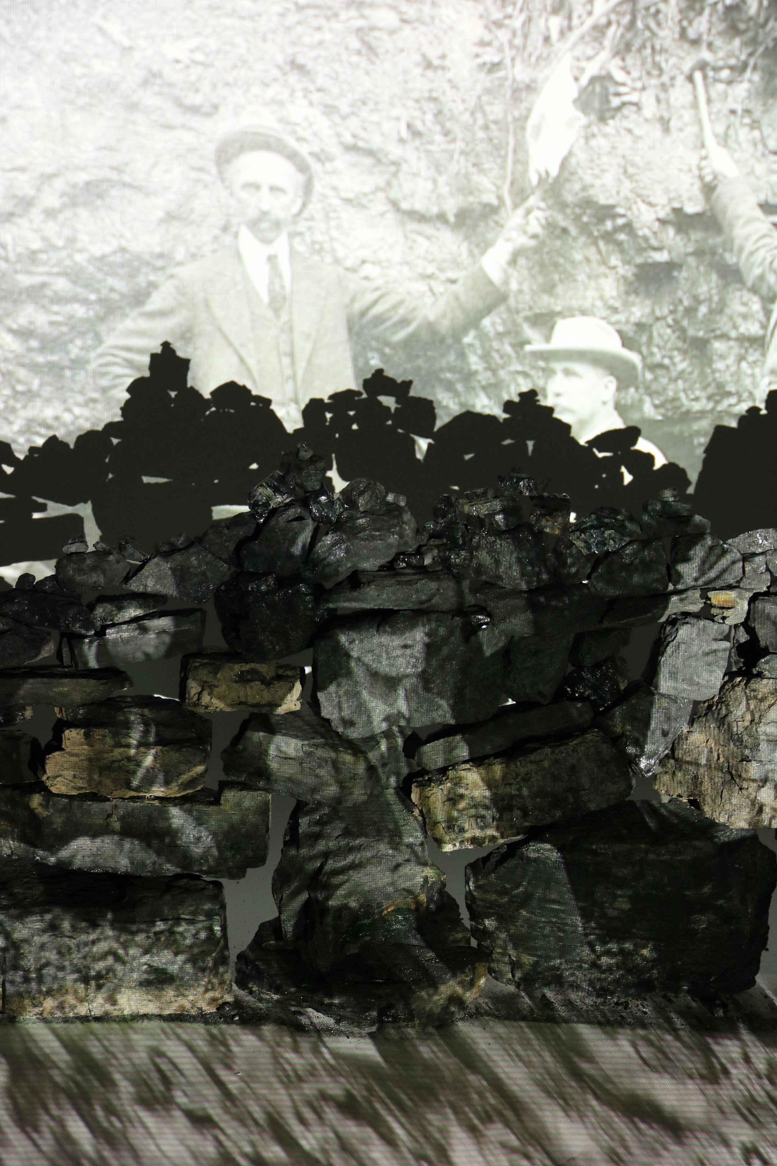 In this installation, the Mayo family poses again; their gazes now emanate from the very same fossil fuel mineral that was the backdrop to their portrait when it was first captured in light in 1891.